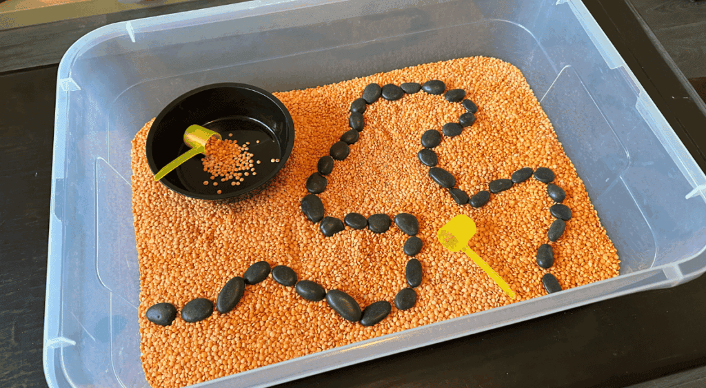 Halloween sensory bins don’t need to be complicated to be engaging. Black beans, dyed rice (orange and purple), and red lentils all work great as a base. Just add a few small pumpkins, scoops, and maybe some plastic spiders and you’re set.
