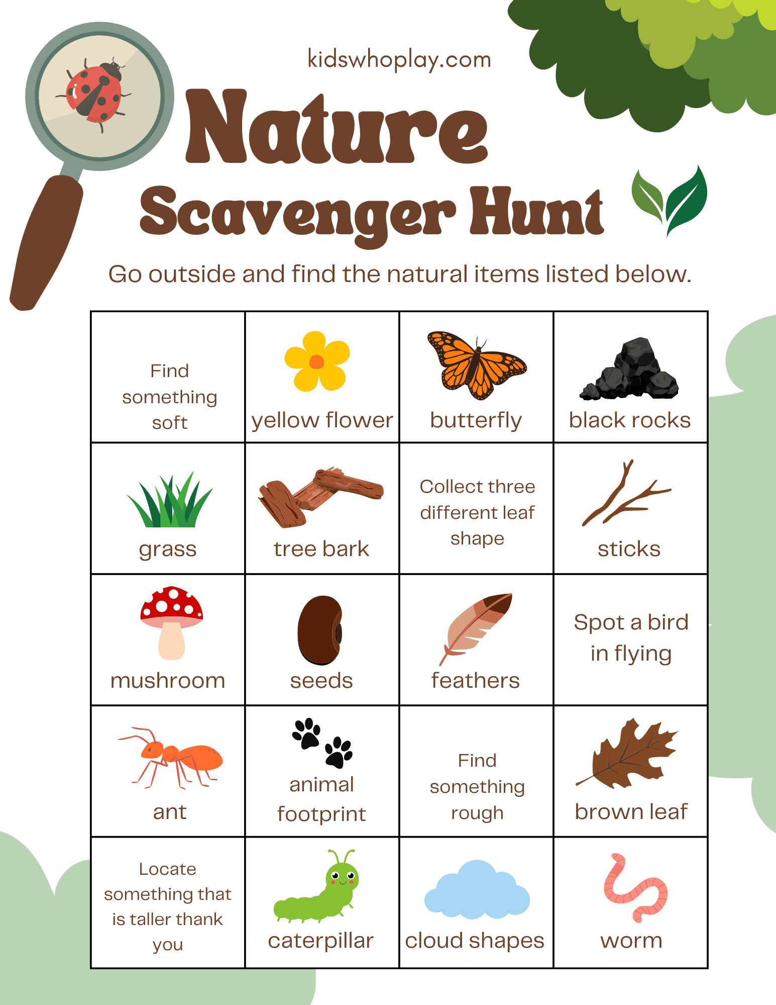 Go on a nature scavenger hunt by looking for items such as specific leaves, rocks, colors, or textures. Kids can make their own lists or follow simple prompts as they explore and search.